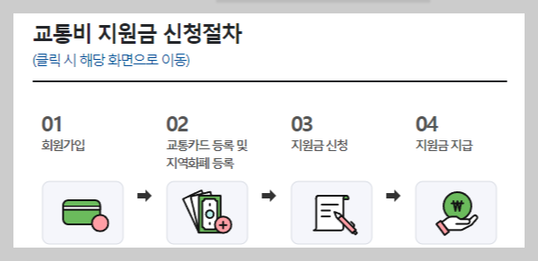 - 기존회원 : 로그인 - 거주지 인증 - 교통카드 및 지역화폐 정보확인 - 신청