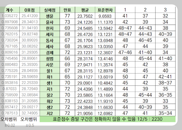 탐구영역 평균. 표준편차. 1~3 실채점 컷 입니다.